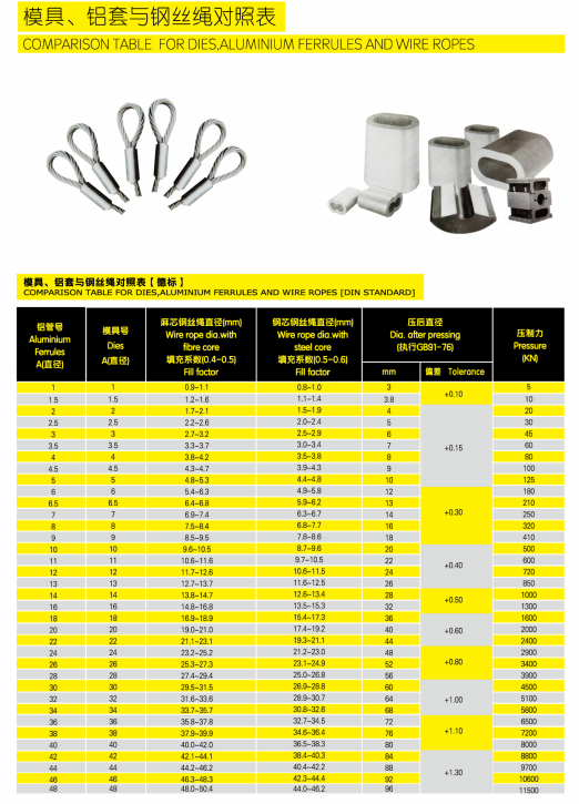 模具、鋁套與鋼絲繩對照表